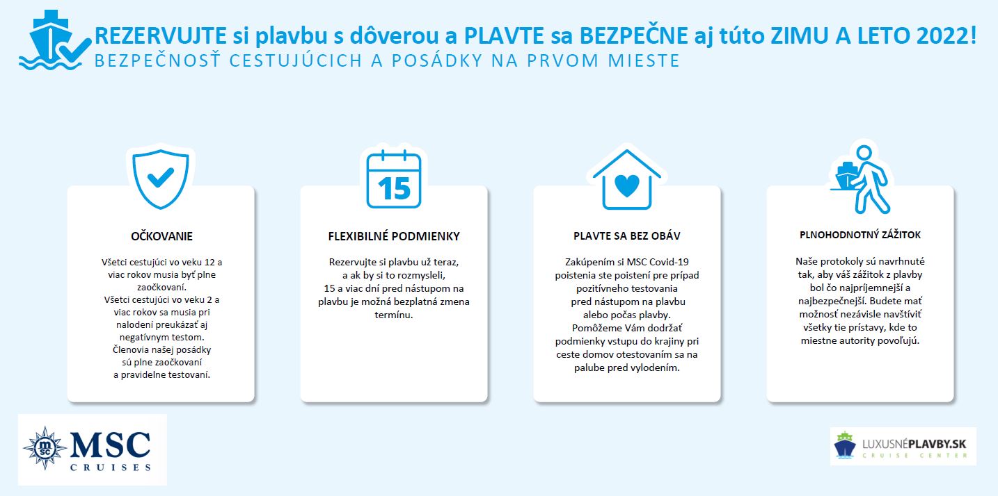 • Plavba bez obáv vďaka MSC Covid-19 poisteniu - všetci hostia a ich rezervácie sú plne chránené požadovaným poistením MSC COVID-19, ktoré pokrýva varianty, ako je pozitívny test pred nástupom na palubu alebo kedykoľvek počas dovolenky. Na konci plavby sa zabezpečí testovanie buď na palube alebo v termináli - podľa požiadaviek krajiny návratu.