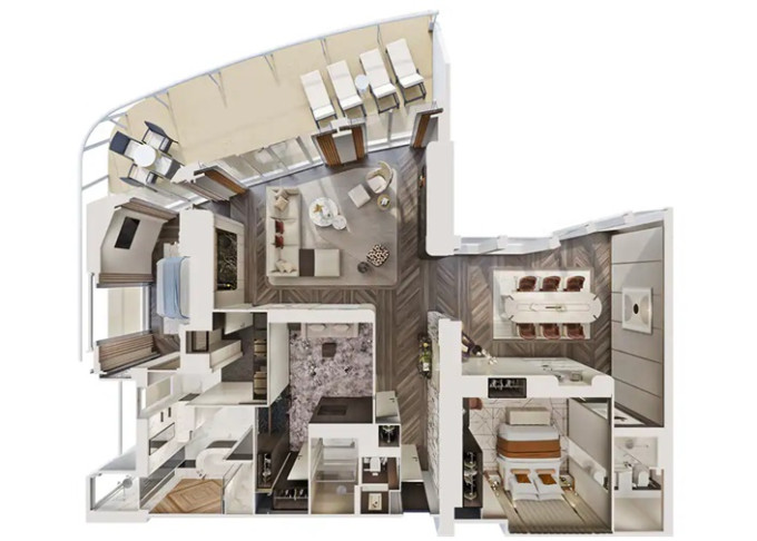 | H2 - The Haven Deluxe Owner's Suite 197 m² / balkón 45 m². 18. paluba vpredu. Max 6 osôb. Výhody The Haven. | 8 954 € 4 477 € za osobu |